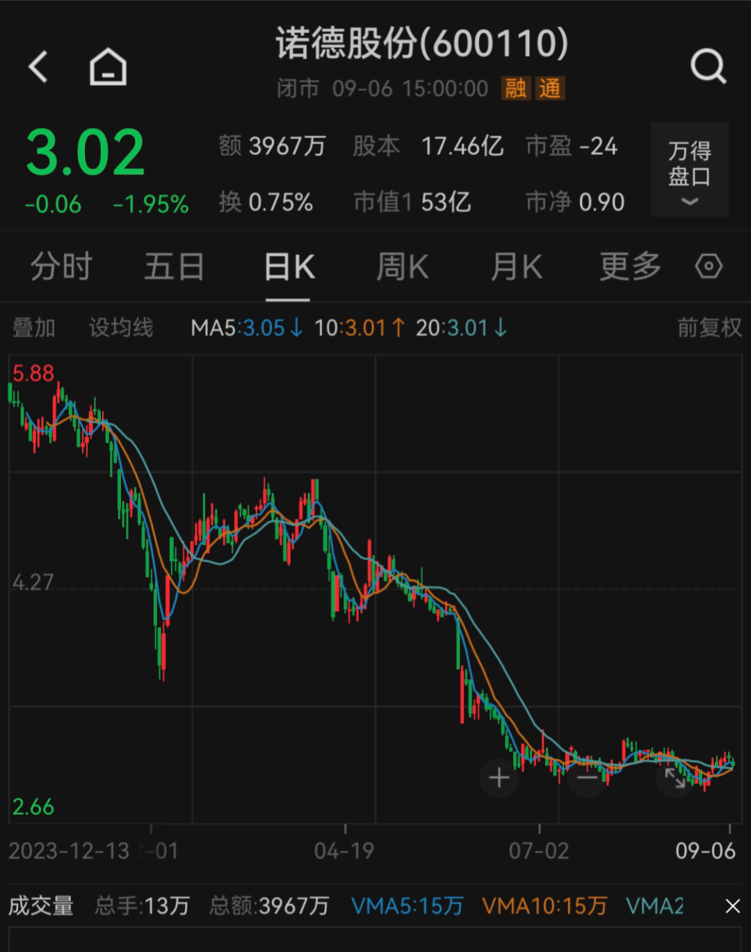 截至9月6日收盘,诺德股份每股报3.02元,年内下跌超46%,公司最新市值为53亿元。